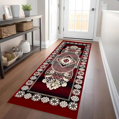 Red Floral Velvet Runner Carpet – Elegant Bedside or Hallway Mat for Home Décor